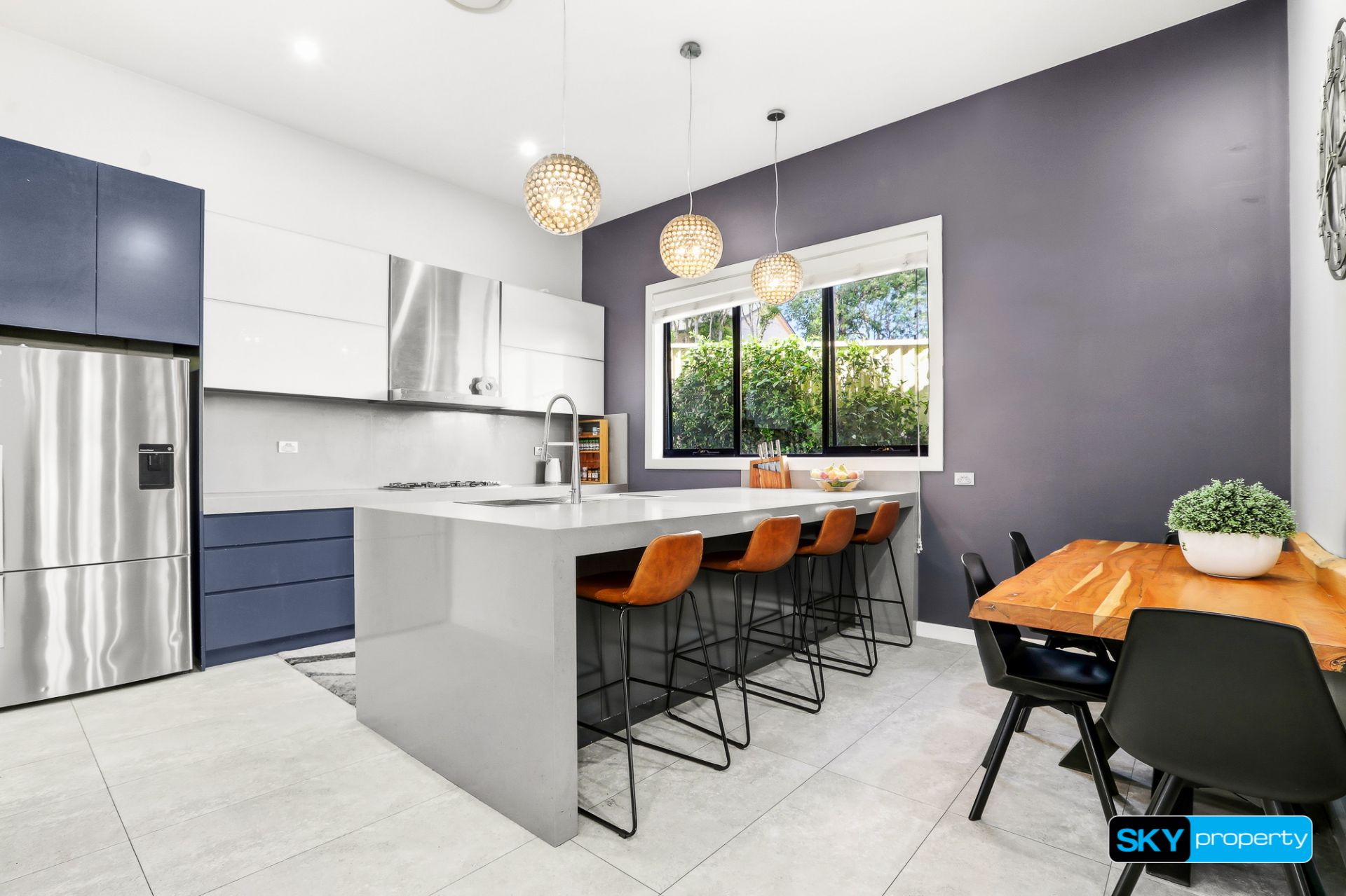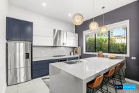 - Designer kitchen with 90mm stone benchtops, quality 900mm appliances, and a walk-in pantry with bench and cupboard space